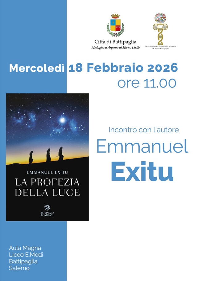 Mercoledì 18 Febbraio, sarà ospite del Comune di Battipaglia lo scrittore e regista Emmanuel Exitu che presenterà il suo ultimo romanzo, “La profezia della luce”, edito da Bompiani.