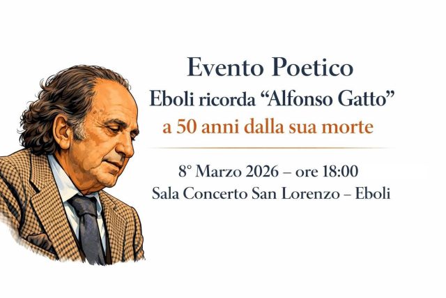 EBOLI – Ed Eboli, il prossimo otto marzo, con inizio alle ore 18.00, nella Sala Concerto San Lorenzo, nel pieno Centro Storico, si celebrerà con una serata di poesia tutta dedicata ad Alfonso Gatto.