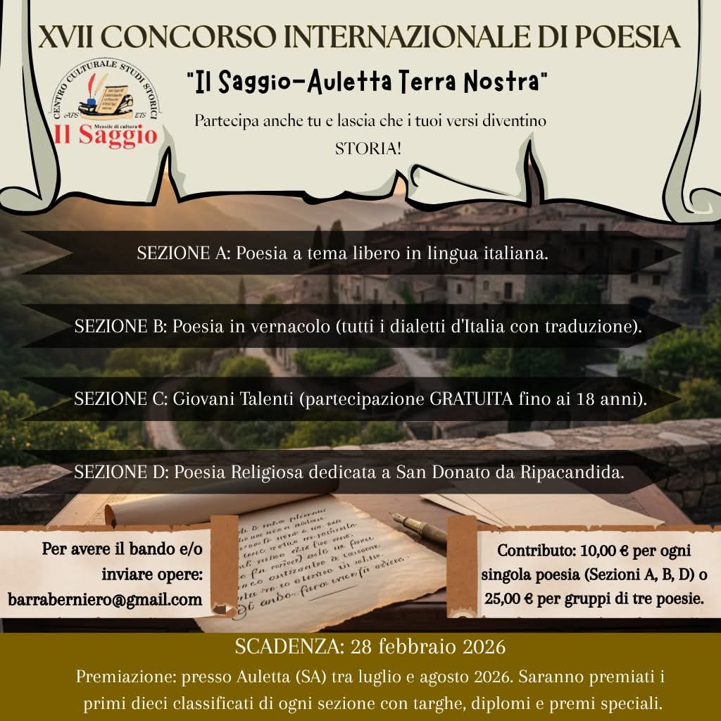 XVII Concorso Internazionale di Poesia – “Il Saggio-Auletta Terra Nostra”. Scadenza 28 febbraio 2026. Il Concorso si articolerà in tre sezioni e saranno premiati primi 10 per ogni sezione.