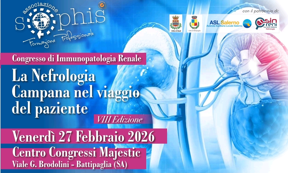 BATTIPAGLIA – Si terrà venerdì 27 febbraio 2026, presso il Centro Congresso Majestic, in Viale G. Brodolini di Battipaglia, l’ottava edizione del Congresso di Immunologia Renale: “La Nefrologia Campana nel viaggio del Paziente“; organizzato dall’Associazione per la Formazione Professionale Sophis, con il patrocinio della Città di Eboli, della Città di Battipaglia e dell’ASL Salerno. Presidente del Convegno: Giuseppe Gigliotti Direttore Unità Operatira Complessa di Nefrologia e Dialisi Centro di prevenzione, diagnosi e cura delle malattie renali del P.O. Maria SS Addolorata di Eboli. Responsabili Scentifici: Giuseppe Bovi, Annalisa Gonnella. La partecipazione all’evento da titolo ad 8 Crediti Formativi ECM.
