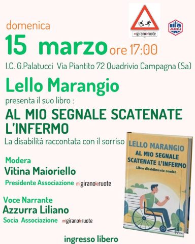 CAMPAGNA – Domenica 15 marzo, alle ore 17.00, nell’aula Magna dell’IC Palatucci del Quadrivio di Campagna, si terrà la presentazione di: “Al mio segnale scatenate l’infermo. Libro disabilmente comico; di Lello Marangio. Un appuntamento da non perdere che racconta la disabilità con il sorriso