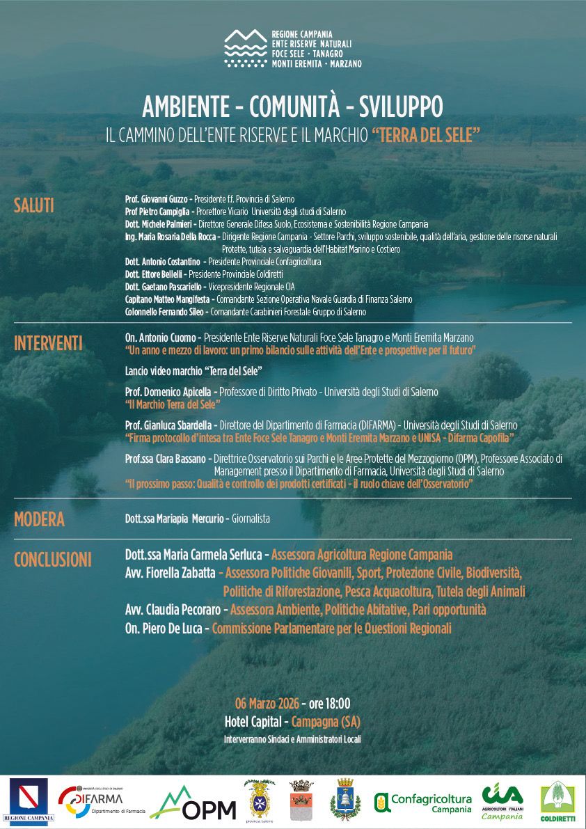 CAMPAGNA / CONTURSI TERME – “Ambiente – comunità – sviluppo. Il cammino dell’Ente Riserve e il marchio ‘Terra del Sele’” è il tema del Convegno promosso dall’Ente Riserve Naturali Regionali Foce Sele – Tanagro e Monti Eremita – Marzano della Regione Campania, che si terrà venerdì 6 marzo 2026, alle ore 18:00, nel Salone delle conferenze dell’Hotel Capital del Quadrivio di Campagna.
