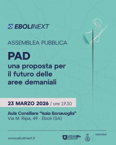 Lunedì 23 marzo ore 17,30, presso l’aula consiliare “Isaia Bonavoglia” Assemblea Pubblica di presentazione, di discussione e condivisione della Proposta del PAD (Piano aree demaniali) della Fascia Costiera della Città di Eboli.