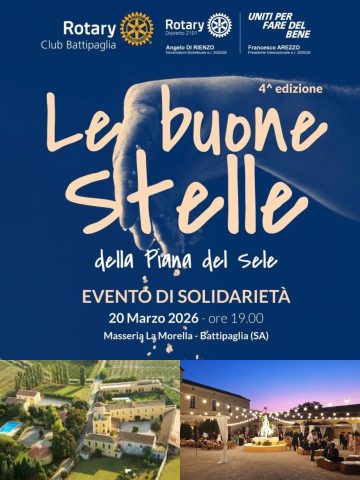 BATTIPAGLIA – Il Rotary Club Battipaglia lancia la quarta edizione dell’Evento di Solidarietà “Le Buone Stelle”, in programma il prossimo 20 marzo 2026 dalle ore 19.00 nella meravigliosa cornice della Masseria La Morella, storica dimora contadina che conserva ancora intatte le sue suggestive bufalare e gli antichi edifici agricoli, oggi trasformati in eleganti strutture ricettive.