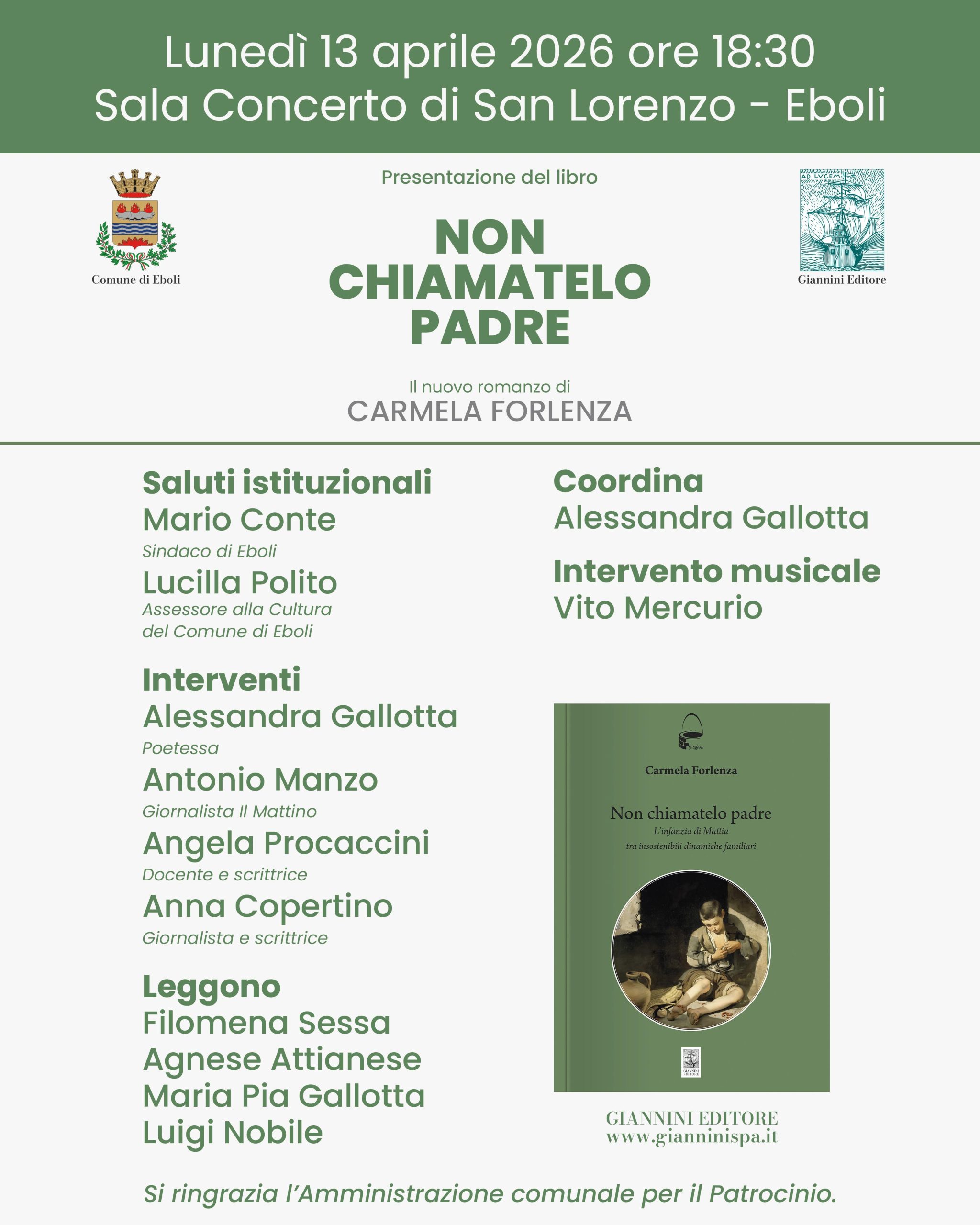 EBOLI – Lunedì 13 aprile 2026, alle ore 18.30, nella Sala dei Concerti della Chiesa di San Lorenzo, nel cuore del Centro Storico di Eboli, si terrà la presentazione del Libro “Non chiamatelo padre“, Giannini editore, il nuovo romanzo dell’artista e scrittrice Carmela Forlenza, accompagnata da un intervento musicale del Maestro e compositore Vito Mercurio.