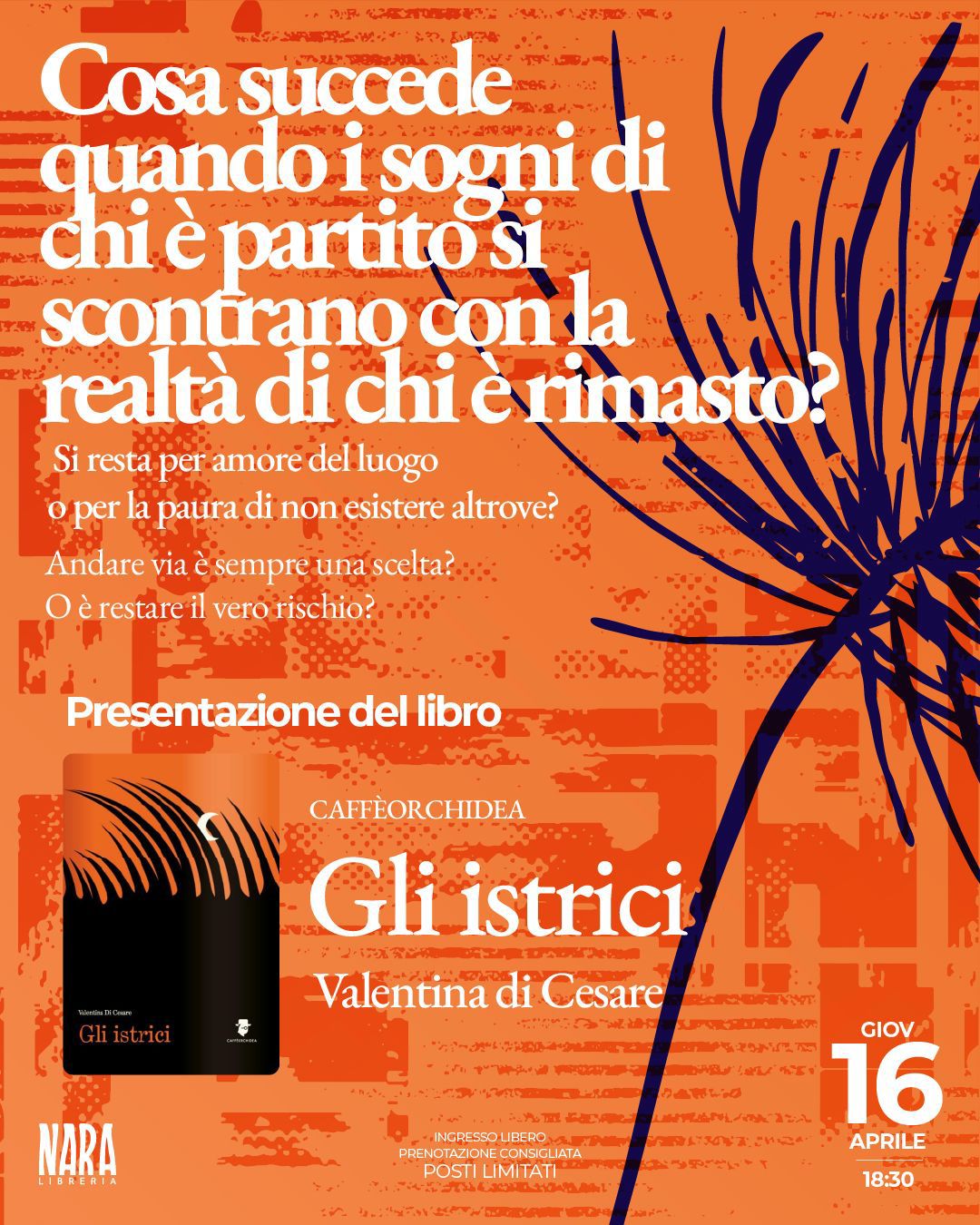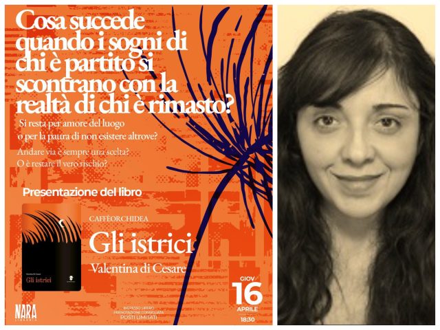 EBOLI – Si resta per amore del luogo o con la paura di non essere altrove? Andare via è sempre una scelta? O restare è un vero rischio? Cosa succede quando i sogni di chi è partito si scontrano con la realtà di chi è rimasto? Domande che hanno più risposte ma che in ogni caso sono sempre scelte che fanno i conti con le proprie sofferenze. Domande alle quali si cercherà di dare delle risposte giovedì 16 aprile 2026, alle ore 18.30, presso la Libreria “Nara” in Via Ripa di Eboli, laddove si terrà, organizzata dalla Casa Editrice “Caffèorchidea“, la presentazione del libro “Gli Istrici” di Valentina di Cesare, edizioni Caffèorchidea. Un romanzo sullo spopolamento dei borghi, tra l’altro selezionato dalla Giuria dei Letterati del Premio Campiello.