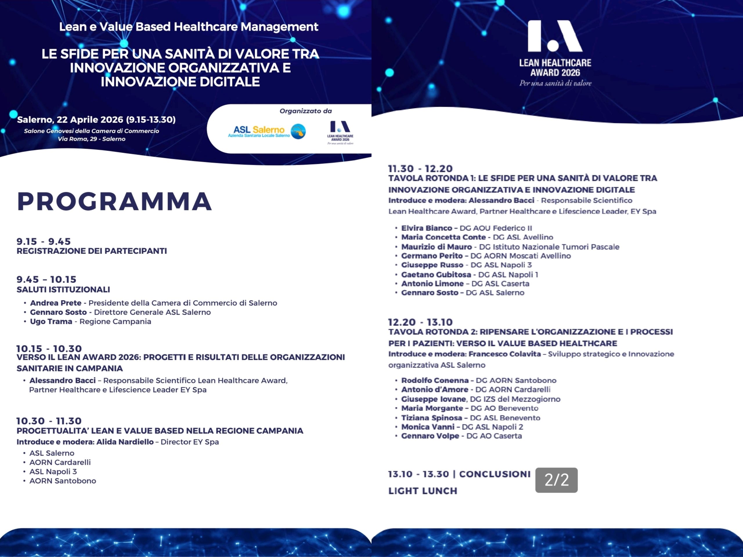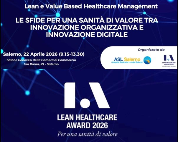 Mercoledì, 22 aprile 2026, ore 09.00, Salone “Genovesi”, Camera Commercio Salerno, prima tappa del Lean Healthcare Award 2026, iniziativa incentrata sul tema: “Le sfide per una sanità di valore tra innovazione organizzativa e innovazione digitale”. Interverranno: Prete, Sosto e Trama.