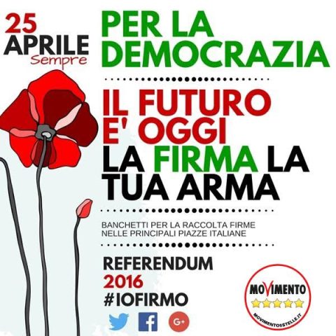 Domenica 24 aprile, Via Italia angolo via Mazzini, prosegue la raccolta firme per i Referendum abrogativi dell’Italicum.